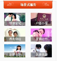 查看多屏優(yōu)化技術專題 >>玉龍縣政府門戶網(wǎng)站為用戶提供場景導航服務。圍繞需求組織相關場景、導航和服務,提供可視化的場景式服務,使公眾在最短時間內(nèi)對整個辦事流程和內(nèi)容了然于心,讓用戶做幾步簡單的選擇,便可引導用戶獲取到合適的信息,獲取有高度針對性的服務,節(jié)省時間。玉龍縣政府門戶網(wǎng)站場景式服務分為“婚姻登記”、“戶籍辦理”、“養(yǎng)老保險”、“生育收養(yǎng)”、“我要上學”和“我要就醫(yī)”六部分,使用戶根據(jù)需求,按指引的辦事流程操作即可。