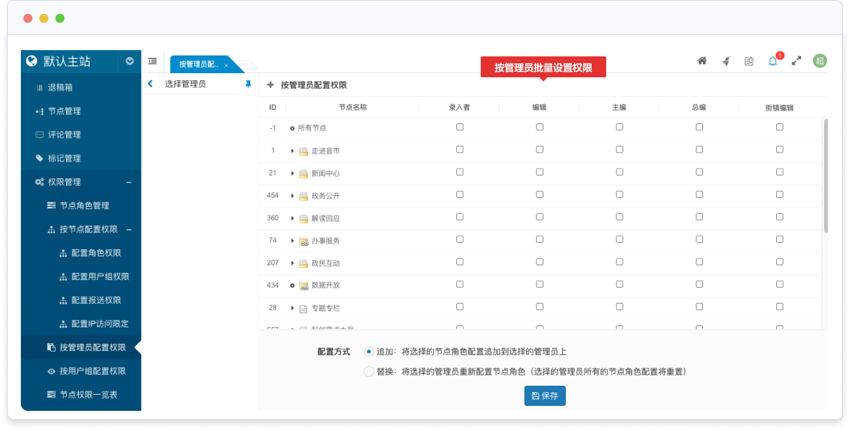 - 通過配置各欄目(節(jié)點)節(jié)點角色的管理員,可以為不同欄目指派特定管理員進行管理
