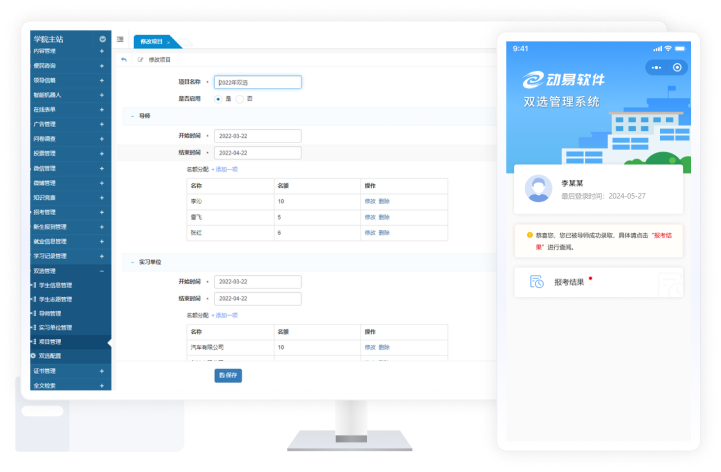 支持設(shè)置項(xiàng)目信息,包括設(shè)置項(xiàng)目的開始時(shí)間和結(jié)束時(shí)間,以及學(xué)生可以選擇的導(dǎo)師和實(shí)習(xí)單位,以及相應(yīng)的名額。