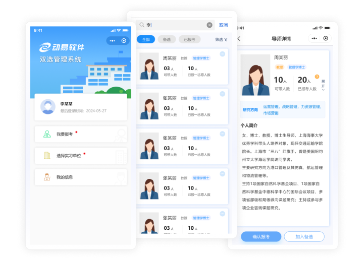 在小程序主頁點(diǎn)擊“我要報(bào)考”后,系統(tǒng)將展示導(dǎo)師列表,學(xué)生可以根據(jù)職稱、學(xué)歷、研究方向等條件篩選導(dǎo)師。點(diǎn)擊導(dǎo)師名稱可以查看其詳細(xì)信息以及報(bào)考該導(dǎo)師的相關(guān)數(shù)據(jù)。學(xué)生可以將導(dǎo)師加入備選或取消備選,并最終確認(rèn)報(bào)考。