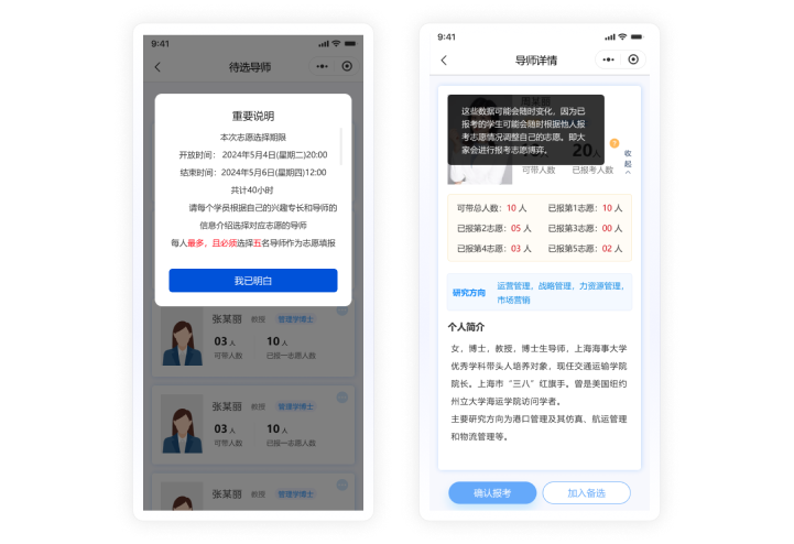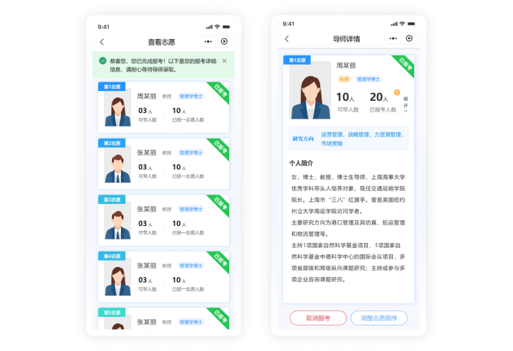 在報(bào)考截止時(shí)間之前,學(xué)生可以隨時(shí)查看和調(diào)整報(bào)考志愿,包括取消報(bào)考或通過拖拽方式調(diào)整志愿順序。每個(gè)導(dǎo)師的報(bào)考名額有配置限制。