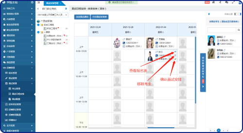 中欄為本次招生考試項(xiàng)目的班級(jí)列表,每個(gè)班級(jí)名稱后顯示相應(yīng)的進(jìn)入面試流程的考生總數(shù),假如有“待安排面試時(shí)間”的考生,則用紅點(diǎn)進(jìn)行提醒。右側(cè)為待安排面試考生列表,中間為面試日程安排表。