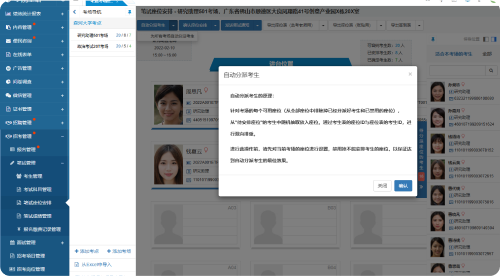 提供座位調(diào)整、自動(dòng)分派考生座位、手動(dòng)分派考生、確認(rèn)座位安排、導(dǎo)出座位表(監(jiān)考老師用)、導(dǎo)出座位表(張貼用)、導(dǎo)出簽到表功能。以及為所有考場(chǎng)自動(dòng)分派考生、確認(rèn)所有考場(chǎng)的座位安排、導(dǎo)出所有考場(chǎng)的座位表(監(jiān)考老師用)、導(dǎo)出所有考場(chǎng)的座位表(張貼用)、導(dǎo)出所有考場(chǎng)的簽到表操作。