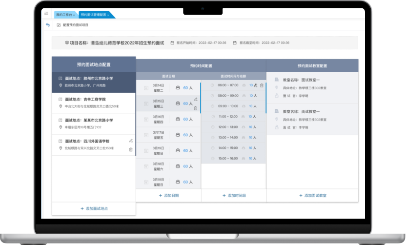 可配置每位考生的面試時長,并設(shè)定面試項(xiàng)目的地點(diǎn)、日期、時間段、面試教室和面試官等參數(shù)。