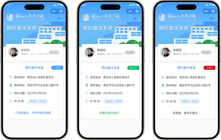 系統(tǒng)在預(yù)約面試日期前三天、前一天、預(yù)約當(dāng)天,以及預(yù)約時間段的前3小時,分別發(fā)送提醒通知,確??忌磿r到達(dá)面試現(xiàn)場。