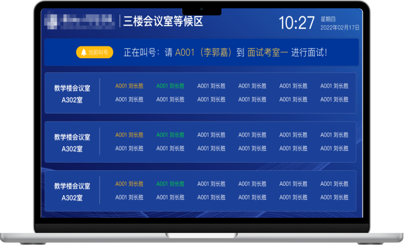 類似醫(yī)院的候診大屏幕設(shè)計,系統(tǒng)設(shè)計了專門的叫號大屏幕,實(shí)時展示并播報正在叫號的考生信息,同時顯示各面試教室中已排隊(duì)考生的序號,方便考生及時到達(dá)指定面試教室等候面試。
