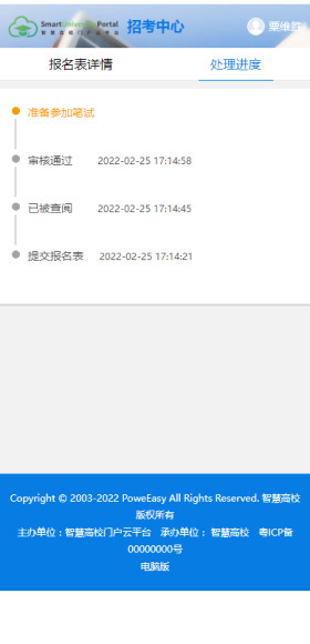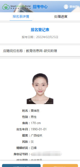 應(yīng)聘者可隨時(shí)查看自己的報(bào)名表。報(bào)名表上方通過進(jìn)度條顯示當(dāng)前狀態(tài)、處理過程和結(jié)果。