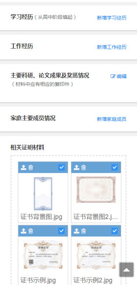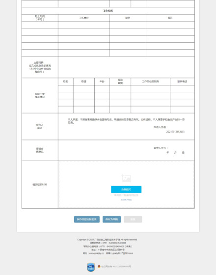 報(bào)名表的填寫采用仿真界面,接近紙質(zhì)報(bào)名表的樣式,并支持上傳相關(guān)證明材料(圖片、視頻、PDF、壓縮文件等格式)。