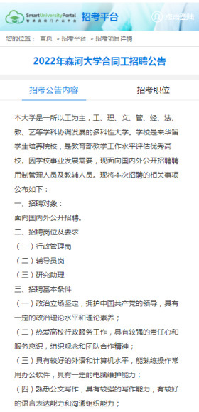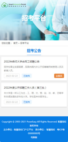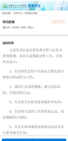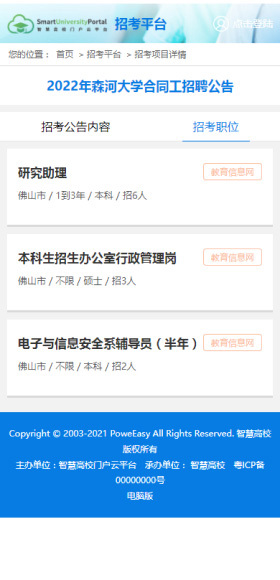 前臺(tái)支持顯示招考項(xiàng)目列表,用戶可以點(diǎn)擊項(xiàng)目名稱查看詳細(xì)信息,并在項(xiàng)目詳情頁中查看相關(guān)的招聘崗位列表。點(diǎn)擊崗位名稱后,可查看該崗位的詳細(xì)信息。