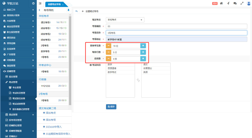 考點(diǎn)和考場(chǎng)的管理功能集成在“筆試座位安排”的考場(chǎng)導(dǎo)航中欄,無需單獨(dú)的管理菜單。