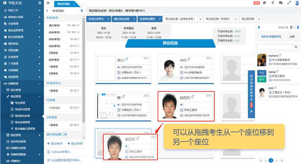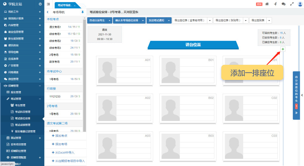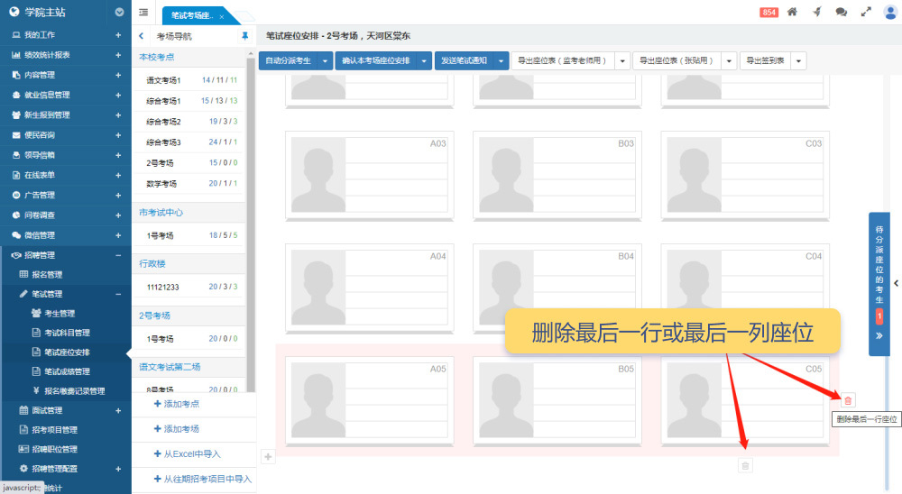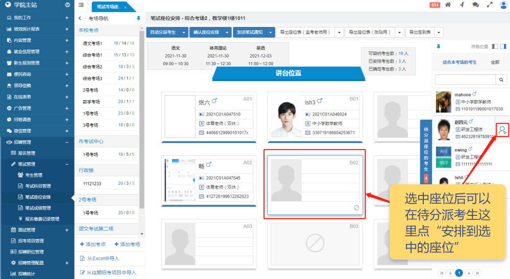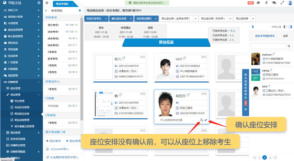 在后臺(tái)管理界面中,中欄顯示考點(diǎn)和考場(chǎng)導(dǎo)航信息。右側(cè)展示座位安排表,以所見即所得的方式顯示每個(gè)座位的考生信息。同時(shí),右側(cè)還包含“待分派座位的考生”區(qū)域(僅在有待分派考生時(shí)顯示)。