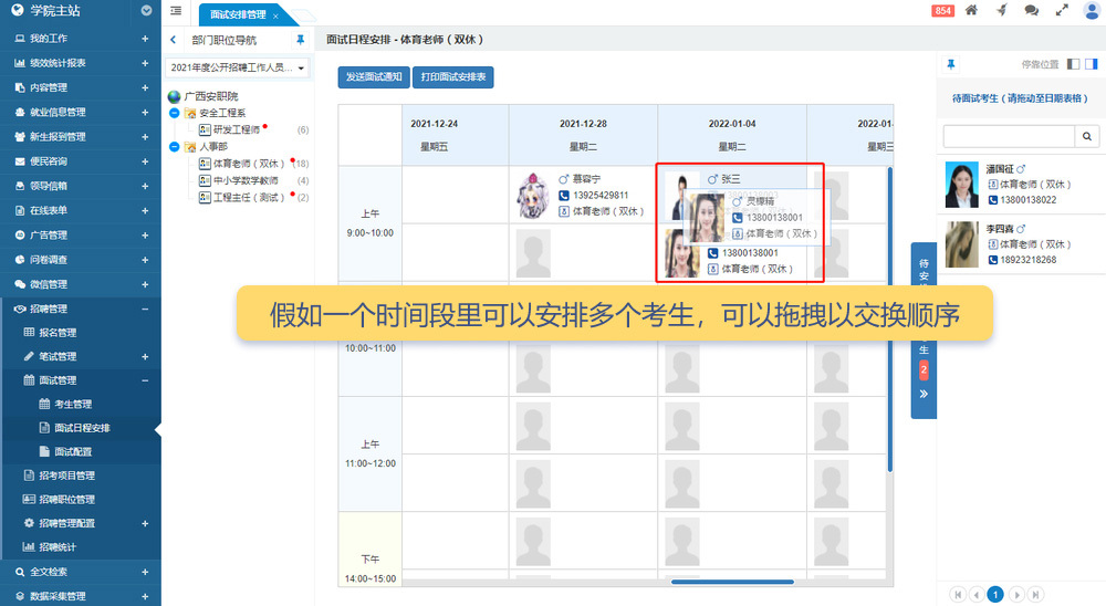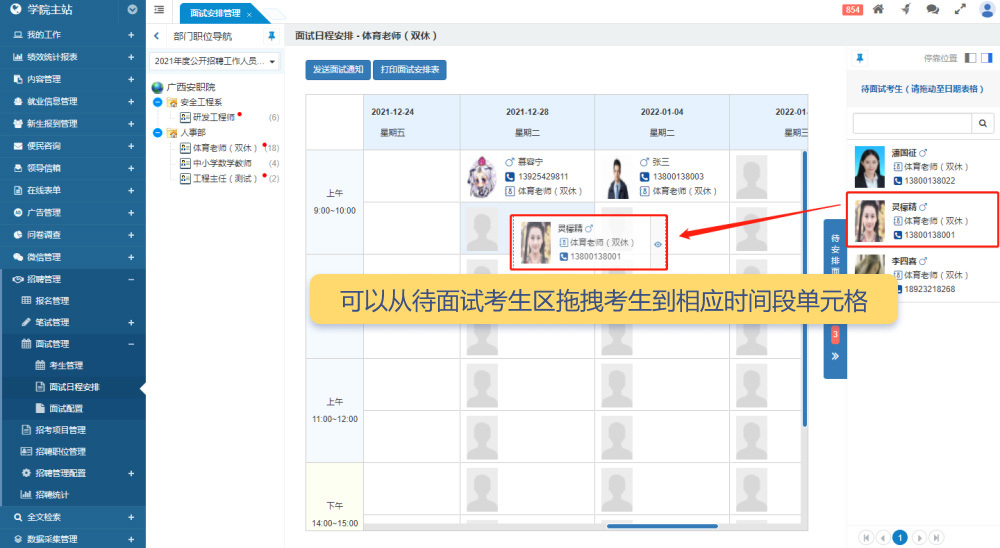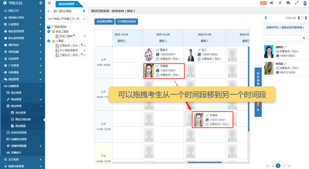面試日程安排表的列為指定的招聘日期,行為面試時(shí)間段,每個(gè)單元格顯示該時(shí)間段的已安排面試考生及其報(bào)考崗位。點(diǎn)擊左側(cè)的招聘崗位,表格將篩選出該崗位已安排面試的考生;點(diǎn)擊右側(cè)的“待安排考生”,表格則篩選出該考生對(duì)應(yīng)崗位的已安排考生。用戶可以將“待安排考生”拖拽到未安排面試的時(shí)間段,也可以在不同時(shí)間段間拖動(dòng)考生。若一個(gè)時(shí)間段內(nèi)有多個(gè)考生,還可通過拖拽調(diào)整順序。已安排好的考生可隨時(shí)移除以重新安排。