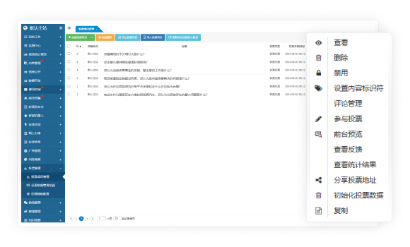 投票項目支持創(chuàng)建、修改、查看、刪除、搜索、篩選、啟用/禁用和前臺預覽等常用功能。還支持復制投票項目,方便快速創(chuàng)建類似的投票項目。主站可以使用子站的投票項目,以便更快地開展投票活動。