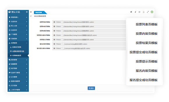 支持配置平臺/支持配置平臺/站點的投票列表頁、內(nèi)容頁、結(jié)果頁等頁面的默認模板,并設(shè)置文件上傳等配置參數(shù)。
