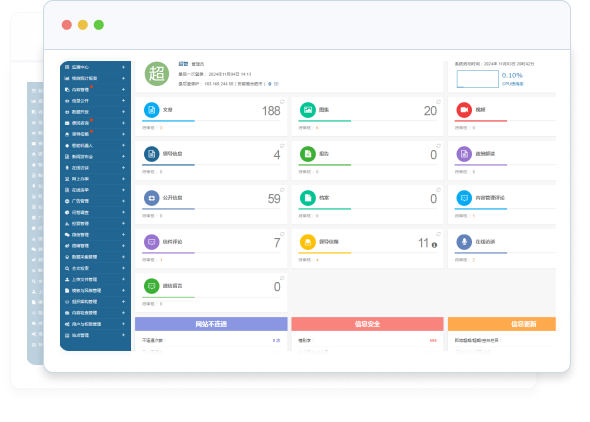 我的工作臺(tái)首頁依據(jù)用戶權(quán)限,集中展示各模塊的統(tǒng)計(jì)數(shù)據(jù)、待審核信息及監(jiān)測中心相關(guān)數(shù)據(jù),用戶可通過點(diǎn)擊相應(yīng)數(shù)字直接跳轉(zhuǎn)至對應(yīng)模塊進(jìn)行處理。