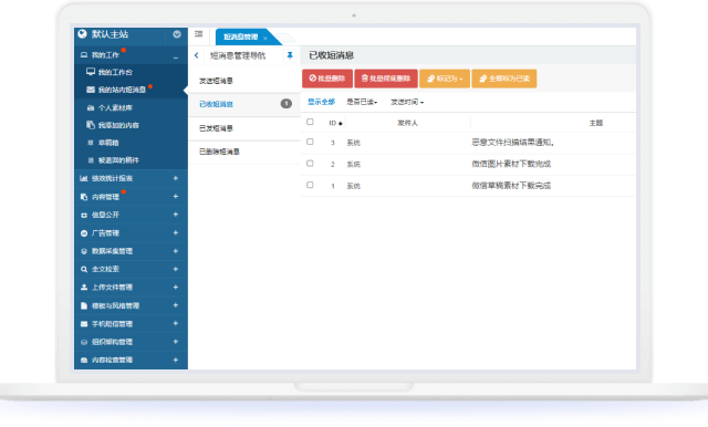當(dāng)有未讀短消息時(shí),管理后臺(tái)右上角的短消息圖標(biāo)會(huì)顯示具體的短消息數(shù)量,并且“我的工作”及“我的站內(nèi)短消息”菜單項(xiàng)會(huì)以紅點(diǎn)標(biāo)記提醒。