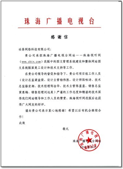 【動易8月12日訊】近日,動易公司收到客戶珠海電視臺發(fā)來的一封熱情誠懇的感謝信,信中表達了其對動易公司承建珠海廣播電視臺媒體新門戶——“珠海視聽網(wǎng)”工作的充分肯定。