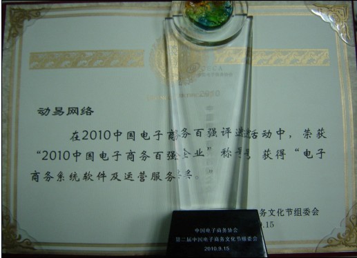 2010年9月15-17日,由中國電子商務協(xié)會和杭州余杭區(qū)政府主辦的“第二屆中國電子商務文化節(jié)暨2010中國電子商務百強峰會”盛大開幕,會上揭曉了我國首個電子商務百強榜。動易軟件作為國內優(yōu)秀的一體化電子商務網站及網站系統(tǒng)整合解決方案提供商,與阿里巴巴、當當、卓越、李寧、京東等知名企業(yè)一道成功入選電子商務百強企業(yè),并榮膺“電子商務系統(tǒng)軟件及運營服務獎十強”獎項!