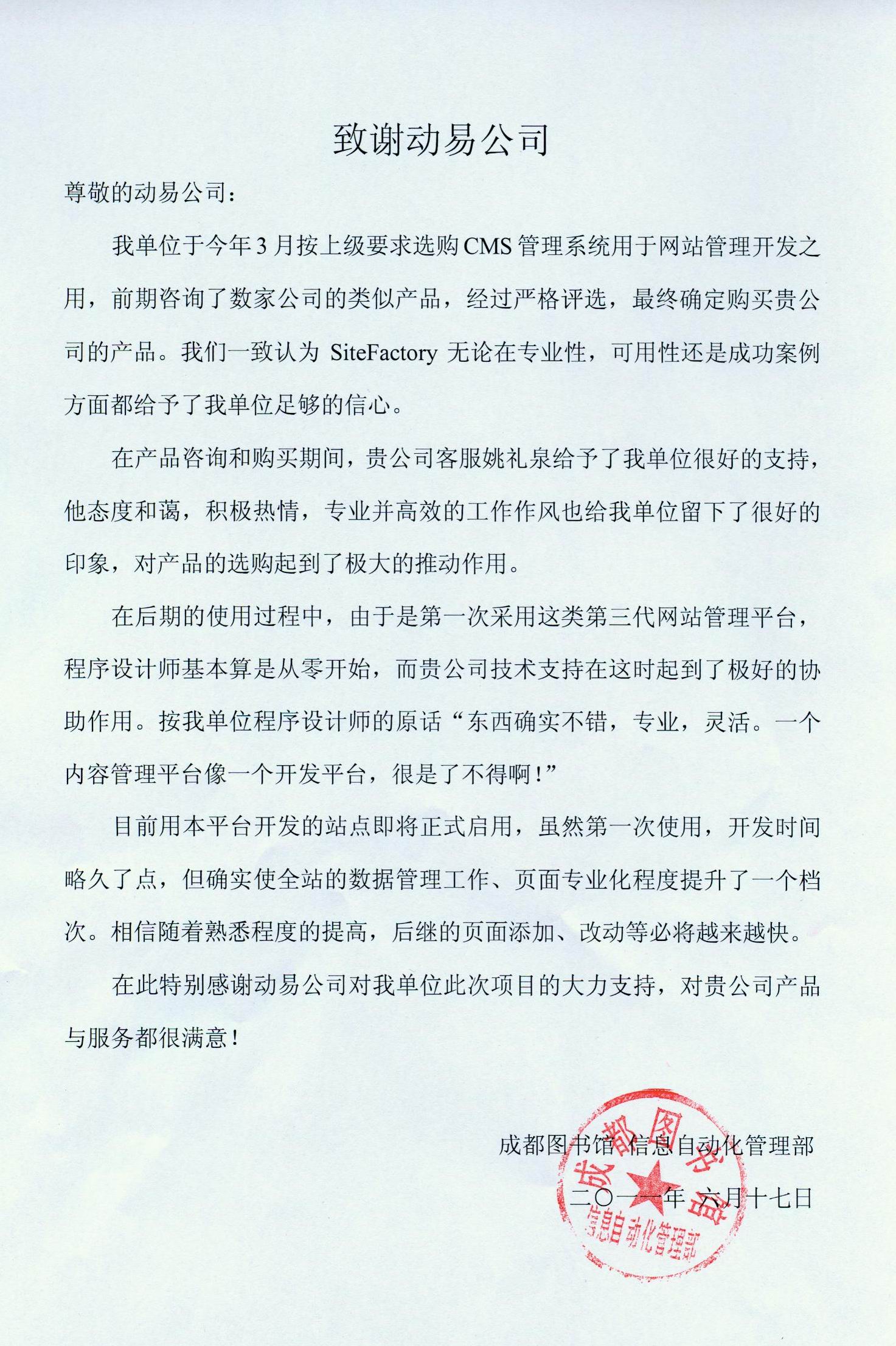 二零一一年六月十七日,動(dòng)易公司收到一封來自成都圖書館發(fā)來的感謝信,客戶在信中充分表達(dá)了對動(dòng)易客服姚禮泉和技術(shù)支持人員的深深謝意,同時(shí)也對動(dòng)易產(chǎn)品做出了很高的評價(jià)。