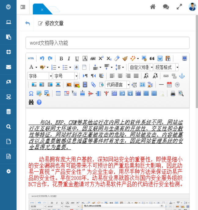 全新架構(gòu)的動易SiteAzure 支持在線導(dǎo)入 Word 文檔,系統(tǒng)將自動對文檔內(nèi)容、字體格式、排版進行識別并保留 Word 文檔樣式,可在內(nèi)容編輯器中可視化展示;同時,Word 文檔中的圖片、表格等文件將自動上傳直接顯示在編輯器里,用戶可以在編輯器中繼續(xù)編輯或排版,也可以無需編輯排版而直接發(fā)布。發(fā)布的文章在網(wǎng)站前臺展示的效果和 Word 文檔中的效果一致。