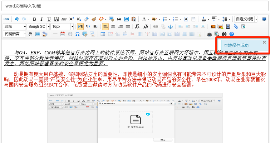全新架構(gòu)的動易SiteAzure 在內(nèi)容編輯時,系統(tǒng)會自動、定時將文檔臨時保存在本地,可以有效的防止突然斷網(wǎng),瀏覽器崩潰所造成的內(nèi)容丟失。