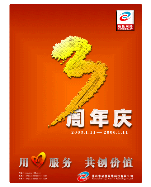 2006年1月11日,動(dòng)易三周年的大喜日子,快樂與網(wǎng)友一起分享! “創(chuàng)意廣告詞有獎(jiǎng)?wù)骷?、“尋找與動(dòng)易同生日的站長”、“周年紀(jì)念優(yōu)惠”、“我與動(dòng)易的故事有獎(jiǎng)?wù)魑摹保拇蠡顒?dòng)板塊邀請(qǐng)您的激情參與!活動(dòng)多多,精彩多多!快來參加吧!