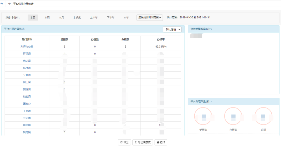 所有信件辦理統(tǒng)計:可平臺對所有信件辦理數(shù)量、結果進行統(tǒng)計,可選擇統(tǒng)計時間范圍。