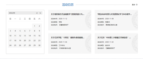 日歷日期鏈接學(xué)院所有活動(dòng),以直觀的表現(xiàn)形式介紹活動(dòng)時(shí)間及情況。同時(shí)采用時(shí)間軸的形式回顧活動(dòng),可以讓訪問(wèn)者快速便捷的訪問(wèn)以往相關(guān)活動(dòng)信息。