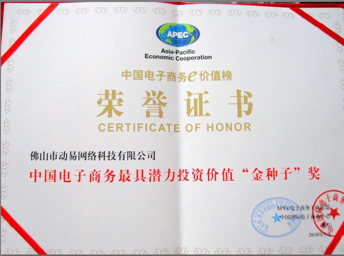 2010年5月21日,由APEC(亞太經(jīng)濟(jì)合作組織)和中華人民共和國商務(wù)部在四川成都主辦的“第四屆APEC電子商務(wù)工商聯(lián)盟論壇”傳出喜訊,按照“成長性、創(chuàng)新性、影響力和經(jīng)典案例”等四項評選標(biāo)準(zhǔn),經(jīng)組委會嚴(yán)謹(jǐn)評定,作為“全程式電子商務(wù)解決方案”的開創(chuàng)者,國內(nèi)最大的網(wǎng)站管理系統(tǒng)提供商,動易公司榮膺“中國電子商務(wù)最具潛力投資價值‘金種子獎’”!。