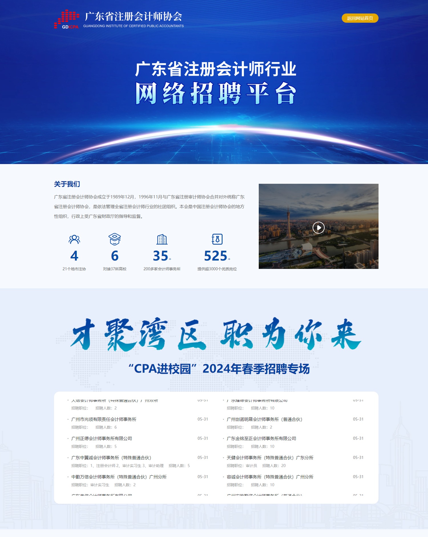 廣東省注冊會(huì)計(jì)師行業(yè)網(wǎng)絡(luò)招聘平臺(tái)是聯(lián)合全省21個(gè)地市注協(xié)搭建的“一站式”垂直招聘平臺(tái),專注于注冊會(huì)計(jì)師行業(yè)的招聘,服務(wù)全省近1100家會(huì)計(jì)師事務(wù)所,為全國大學(xué)畢業(yè)生提供注冊會(huì)計(jì)師行業(yè)的招聘信息,實(shí)現(xiàn)精準(zhǔn)匹配。